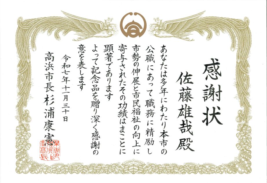 佐藤准教授が高浜市から感謝状を授与されました! |