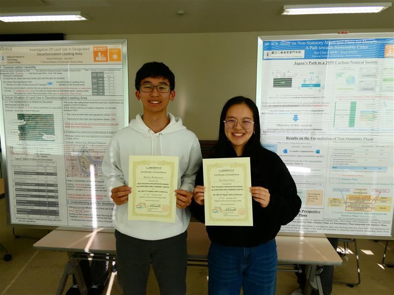 2025年11月11日~12日に開催された10th International Conference of “Science of Technology Innovation” 2025(10th STI-Gigaku 2025)で本校環境都市工学科5年の芳村紘矢さんとChew Sze Chinさんの2名がBest Research Presentation Award by Sumitomo Riko Company Limited(特別協賛企業による優秀研究発表賞)を受賞しました。この国際会議では、本校環境都市工学科都市計画研究室(佐藤准教授)に所属する学生3名の発表を含め、157件の研究発表があり、芳村さんやChewさんを含め27名の方が発表した研究内容が優れていると評価され、Best Research Presentation Awardを授与されました。