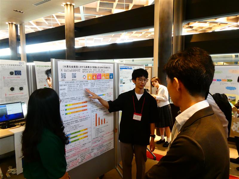 環境都市工学科5年生の芳村紘矢さん・シチンさん(指導教員:佐藤准教授)が、2025年9月6日(月)に奈良県コンベンションセンターで開催された「KOSEN水素フォーラム 2025 in Nara」で研究成果を発表しました。研究者の方々だけでなく、行政関係者や一般市民の方々に研究成果を発表しました。分野や立場が異なる方に研究成果を説明する貴重な経験になりました。